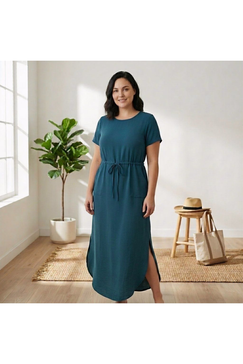 Pohodlné dámské dlouhé šaty s krátkým rukávem a stahováním v pase. Stylový a praktický kousek pro každý den – ideální do práce, na procházky i volný čas.