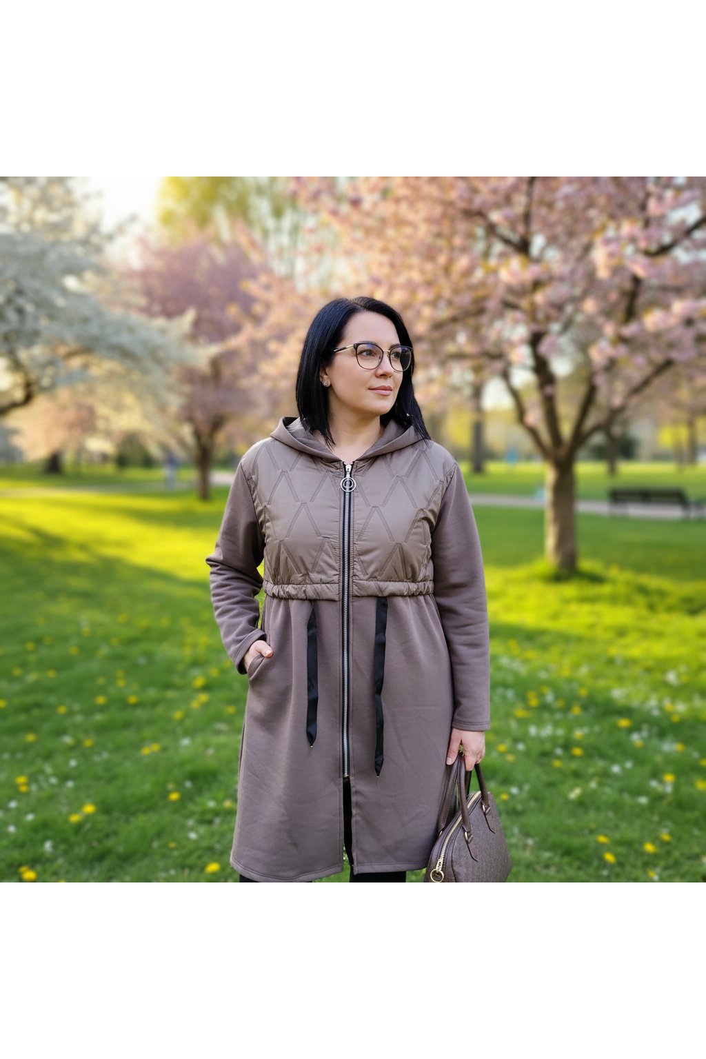 Stylová prodloužená bunda s kapucí v nadčasovém střihu, který lichotí postavě. Příjemný, měkký materiál zaručí pohodlí při nošení, lehce zateplený horní díl zahřeje v chladnějších dnech. Praktické kapsy, zip po celé délce a možnost stažení pod prsy. Skvělá volba na jaro, podzim i chladnější letní večery.