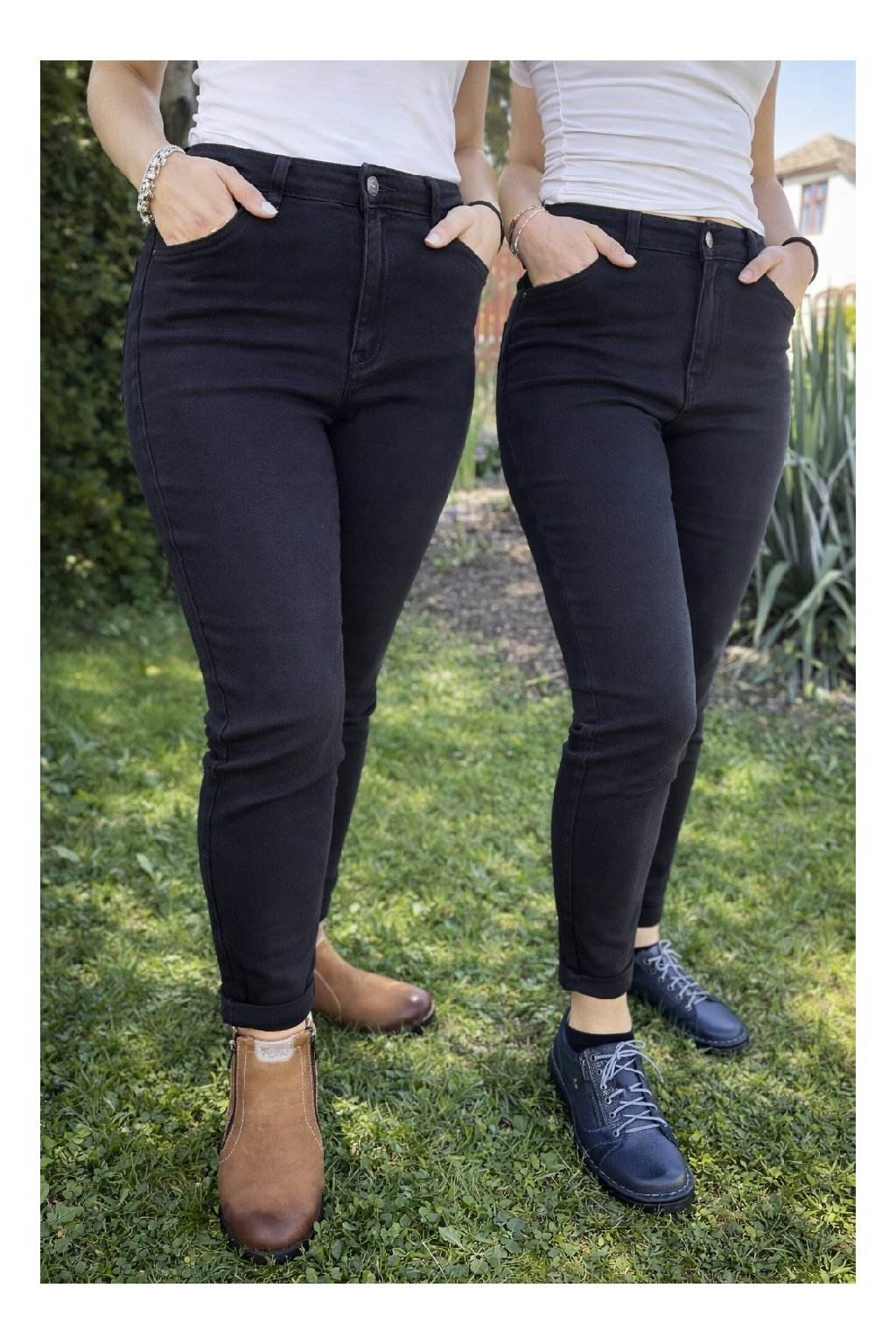 Džíny s moderním "mom fit" střihem mají vyšší pas a velmi pružný příjemný materiál. Nohavice mají volnější střih .  Můžete je nosit i s ohnutými nohavicemi.