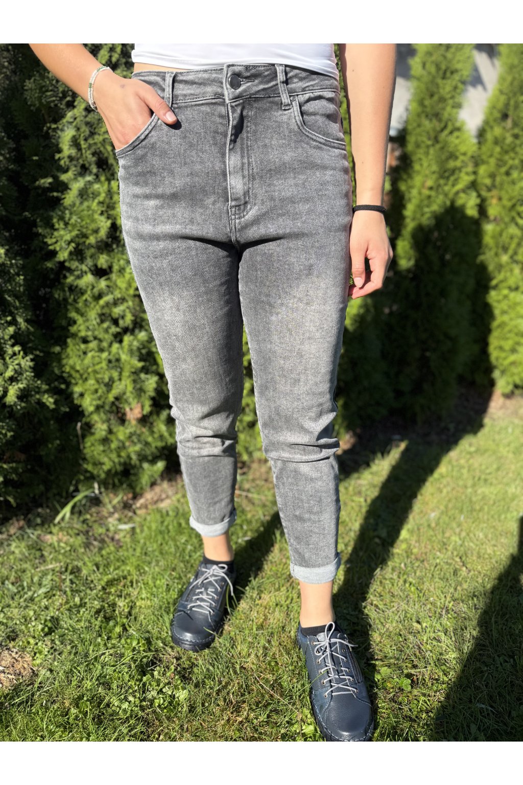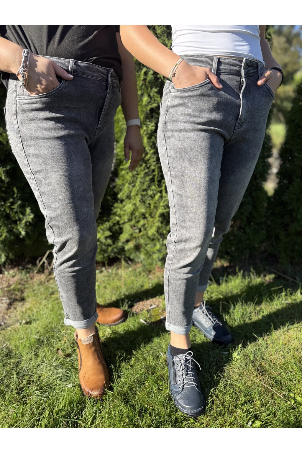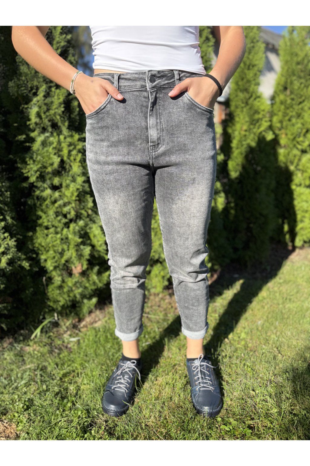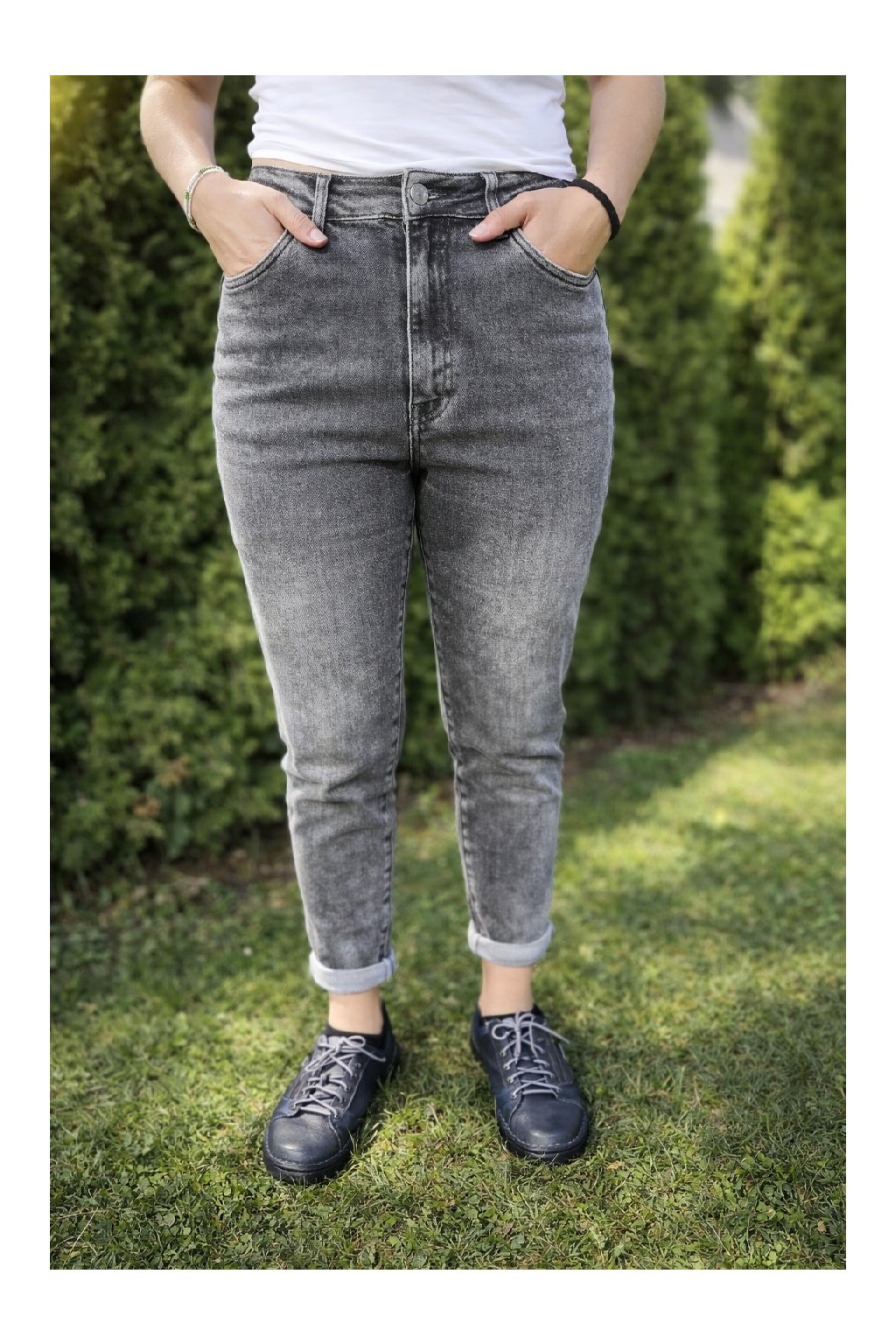 Džíny s moderním "mom fit" střihem mají vyšší pas a velmi pružný příjemný materiál. Nohavice mají volnější střih . Můžete je nosit i s ohnutými nohavicemi.