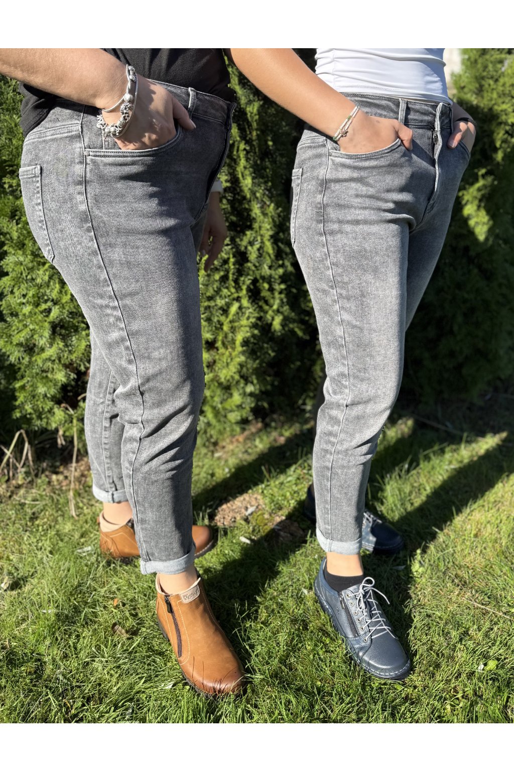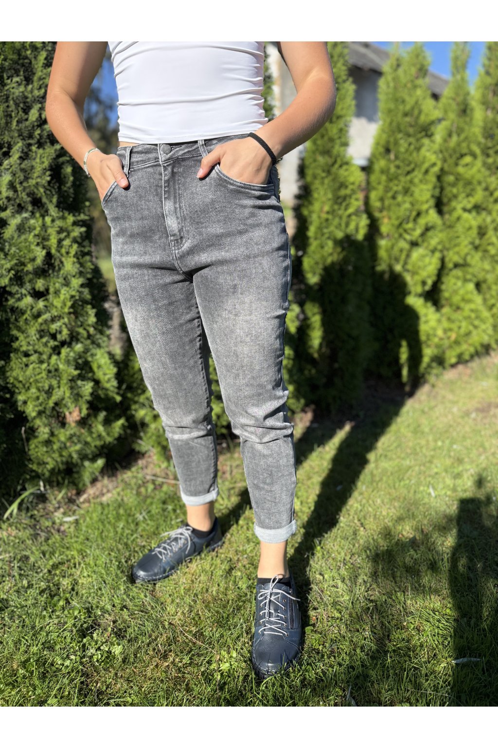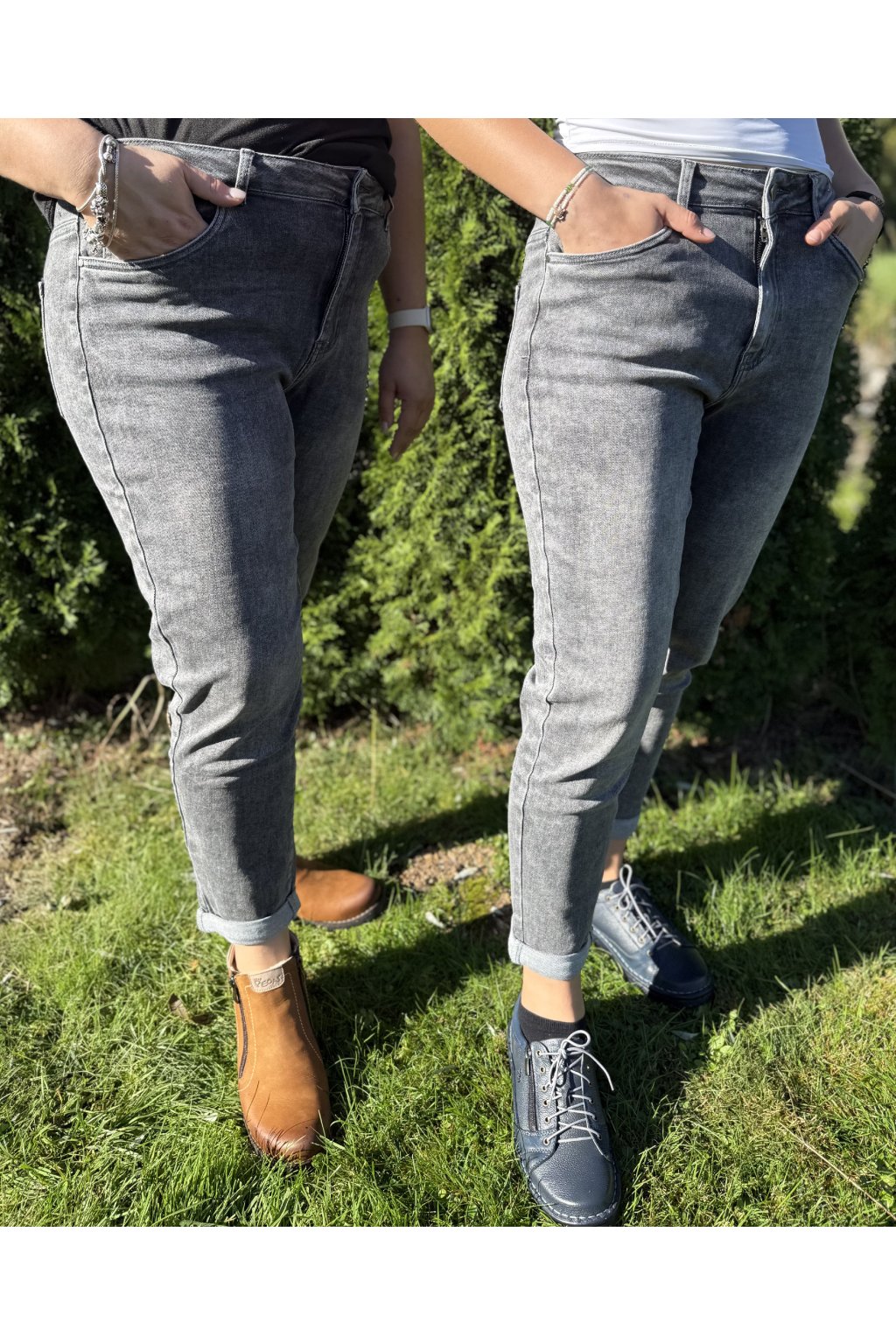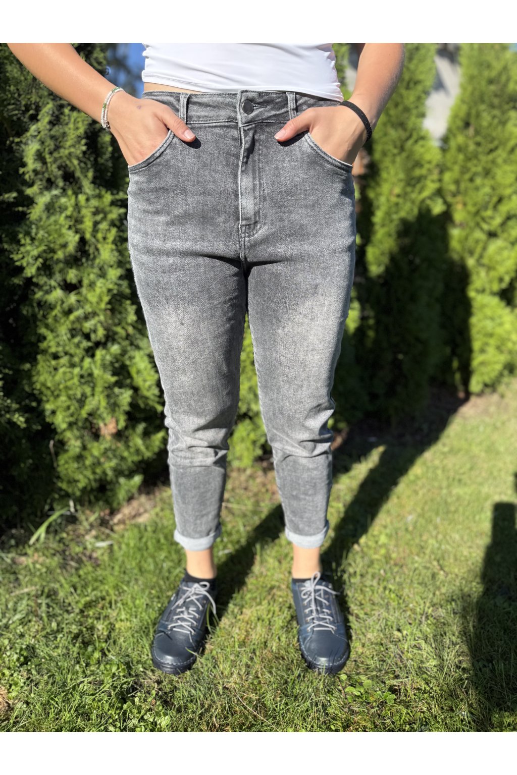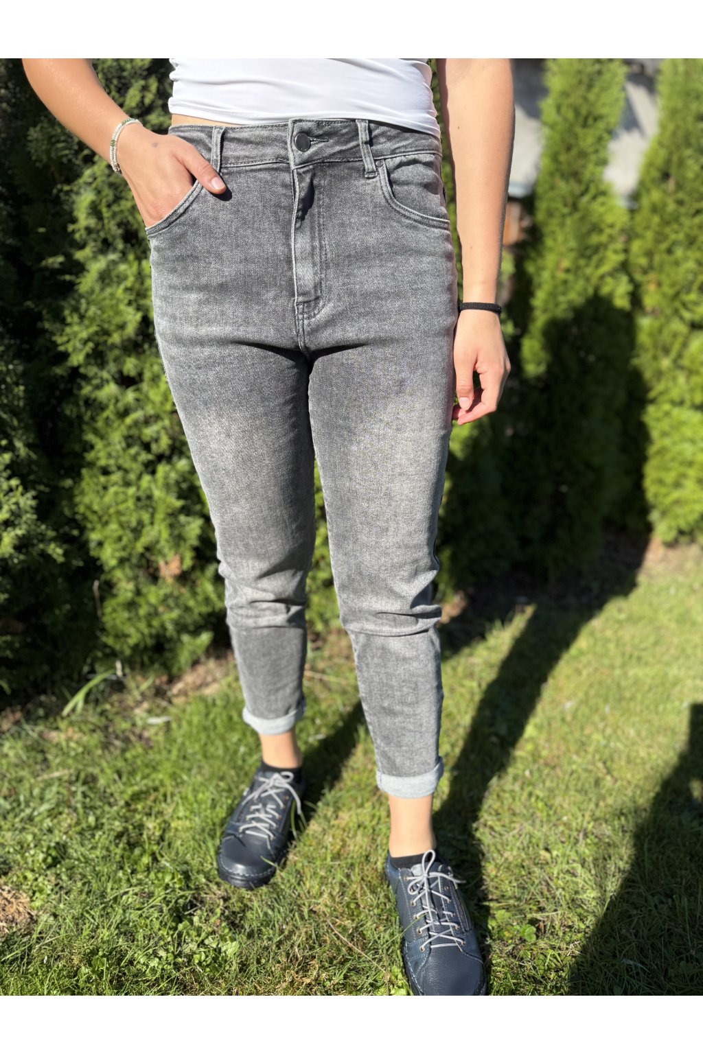 Džíny s moderním "mom fit" střihem mají vyšší pas a velmi pružný příjemný materiál. Nohavice mají volnější střih . Můžete je nosit i s ohnutými nohavicemi.