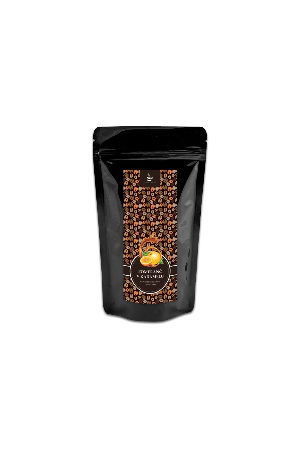 Složení: zrnková káva 100% Arabica, aroma pomeranče a karamelu