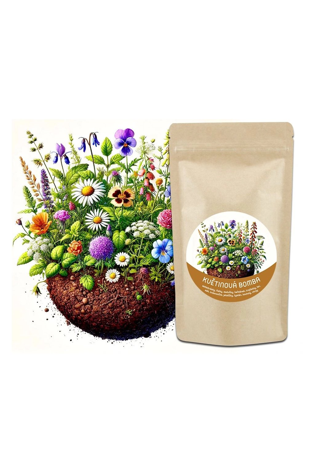 Květinová bomba obsahuje 17 různých druhů rostlinek - jako jsou např. sedmikrásky, fialky, meduňky, heřmánek, trojlístky, len, mák, krásnoočka, jetelíčky, tymián, koukoly, chrpy a mnoho dalších. Každý květinový druh přinese své jedinečné kouzlo a příjemnou vůni.