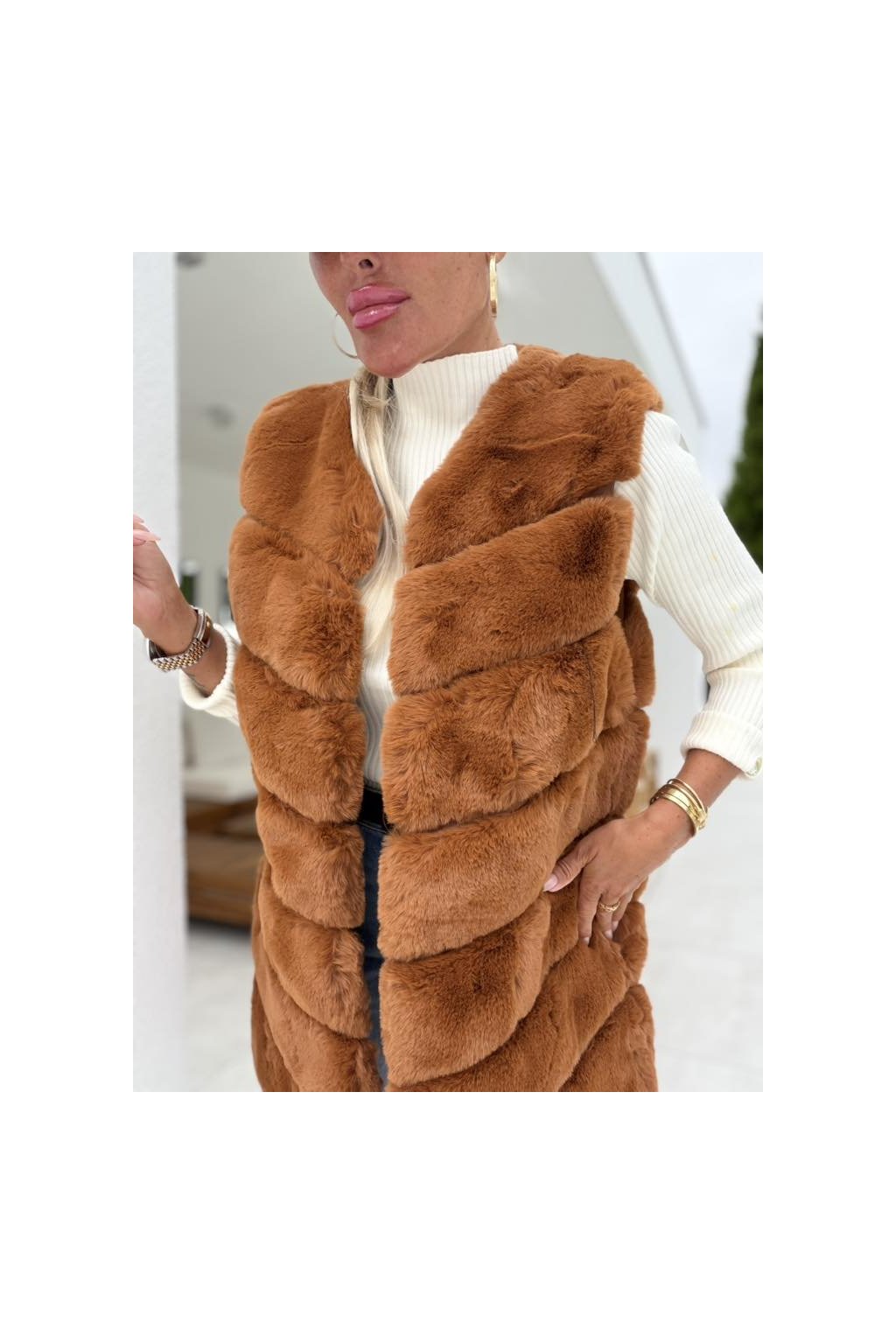 Chlupatá prošívaná vesta s podšívkou a zapínáním.