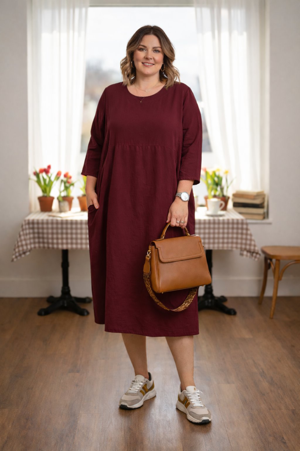 Pohodlné šaty, které unosíš každý den. Ležérní střih, příjemný materiál a délka pod kolena – ideální k teniskám i balerínám.