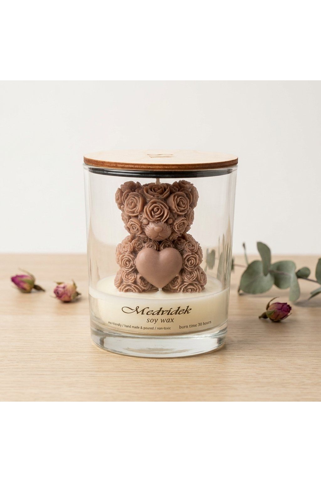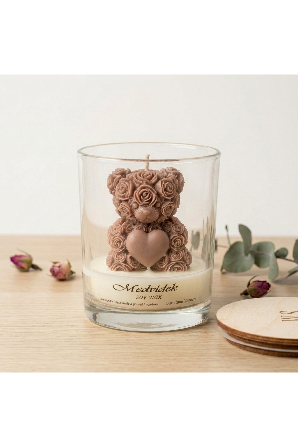 Luxusní sójová svíčka s vůní Georgina a dekorativním medvídkem z růží 🌹 Ručně vyráběná v ČR ze 100% přírodního vosku, hoří čistě a dlouho. Elegantní skleněná nádoba s víčkem z ní dělá krásný doplněk i originální dárek.