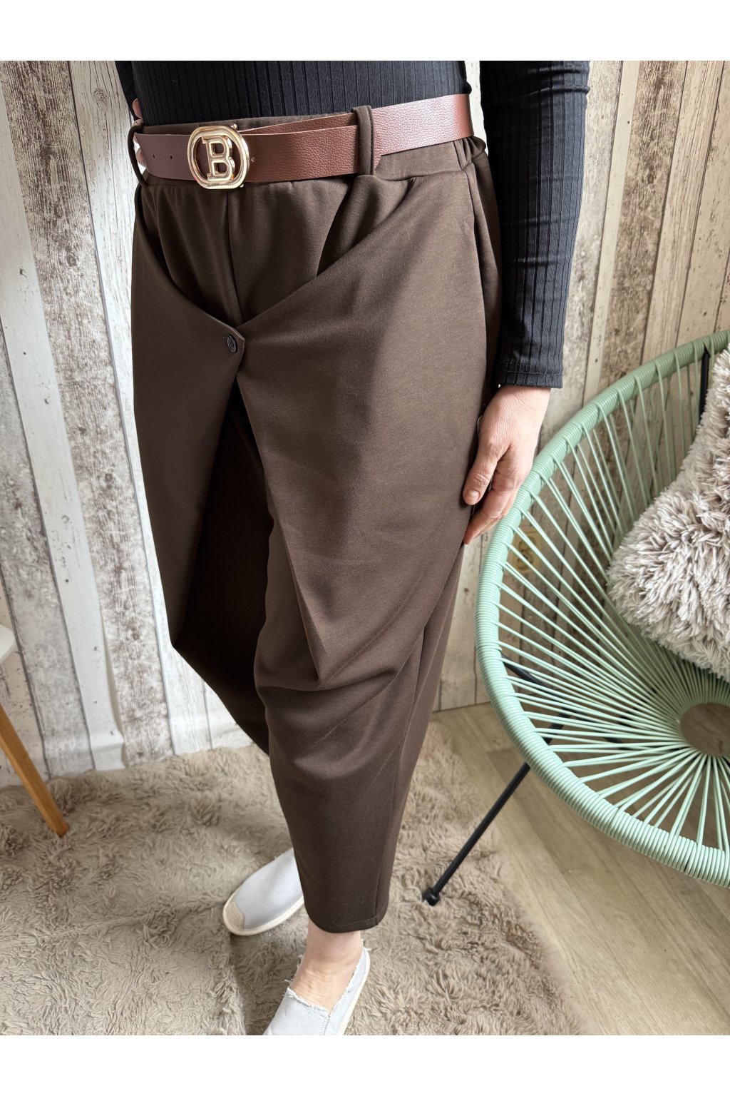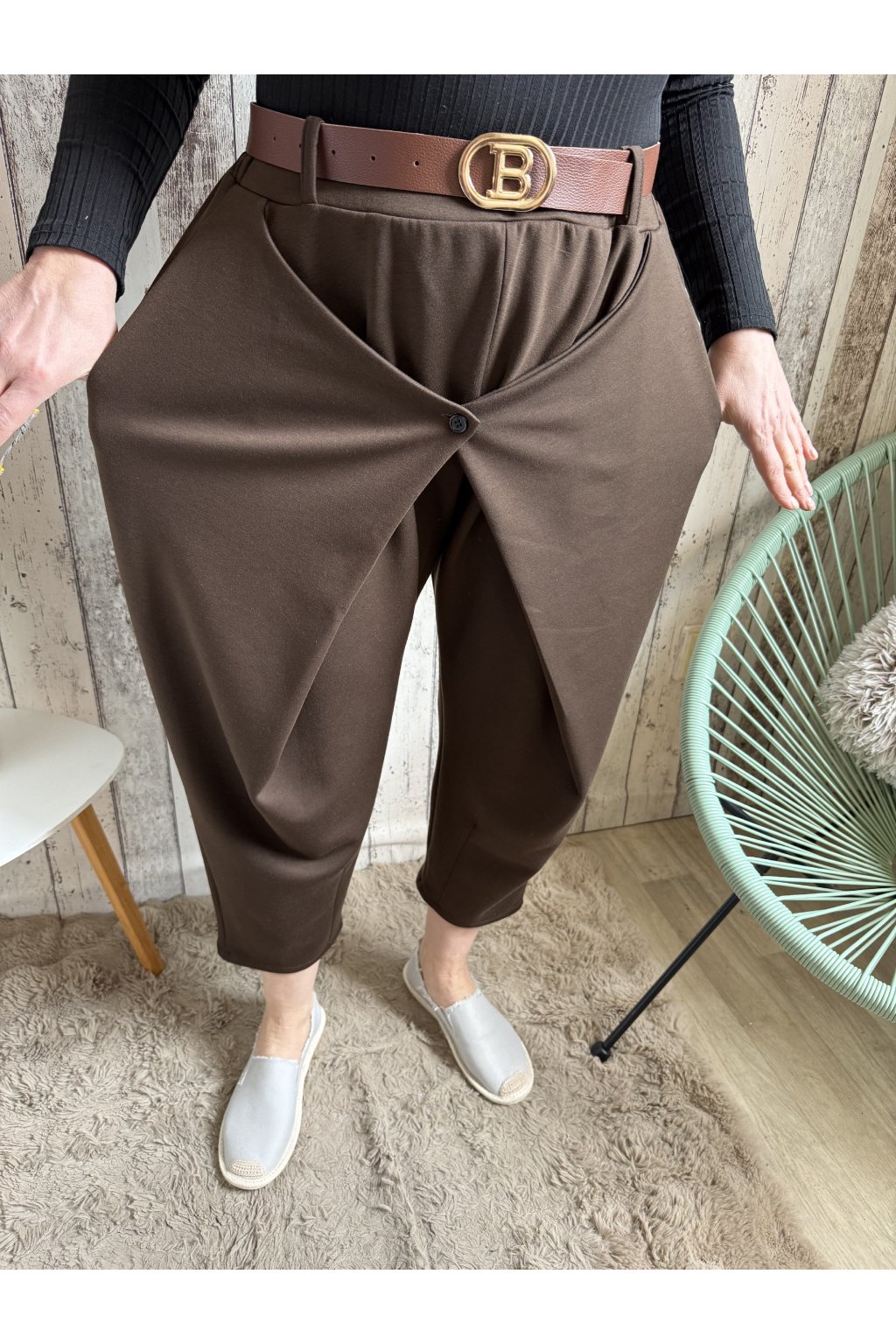 Stylové dámské kalhoty s moderním překladem vpředu jsou ideální volbou pro ženy, které chtějí pohodlí i eleganci v jednom. Díky volnějšímu střihu v oblasti boků a zúženým nohavicím krásně sedí postavám a lichotí ženským křivkám. Přední překlad s knoflíkem vytváří zajímavý designový detail, který kalhotám dodává originální vzhled.
