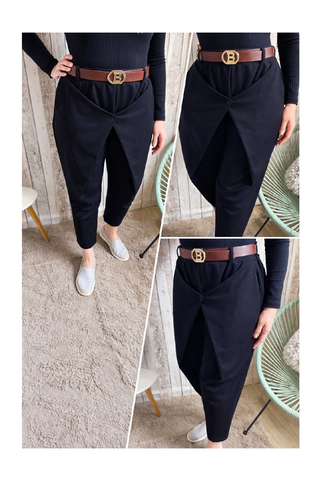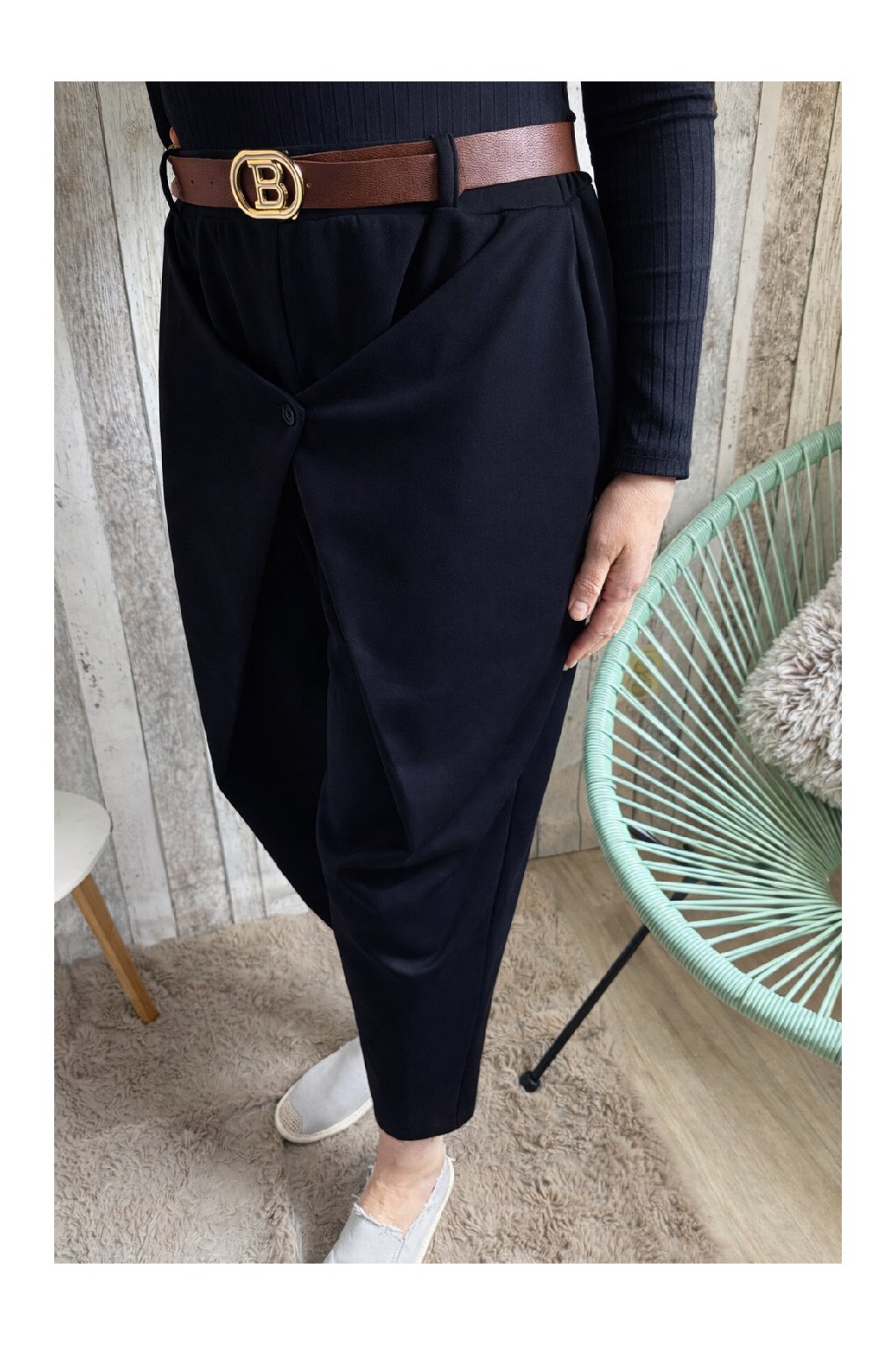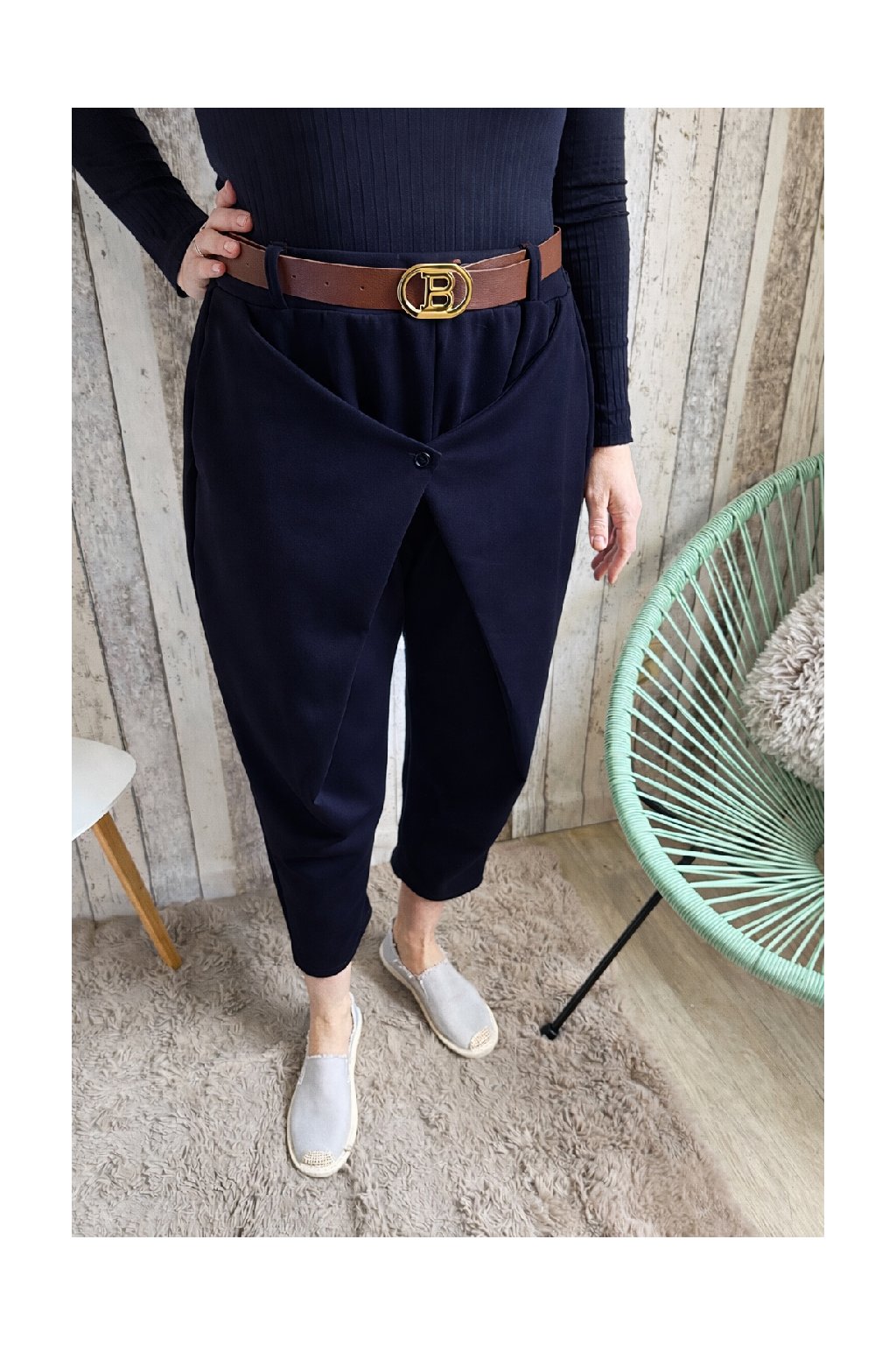 Stylové dámské kalhoty s moderním překladem vpředu jsou ideální volbou pro ženy, které chtějí pohodlí i eleganci v jednom. Díky volnějšímu střihu v oblasti boků a zúženým nohavicím krásně sedí postavám a lichotí ženským křivkám. Přední překlad s knoflíkem vytváří zajímavý designový detail, který kalhotám dodává originální vzhled.