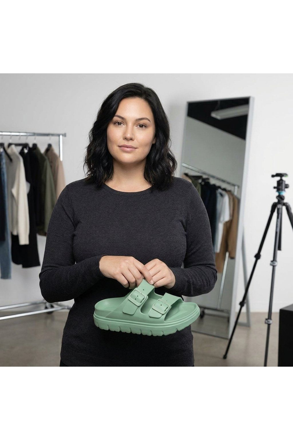 Stylové dámské pantofle ve  mint barvě s dvojitou přezkou. Pohodlné, lehké a ideální na léto – na běžné nošení, dovolenou i k vodě.