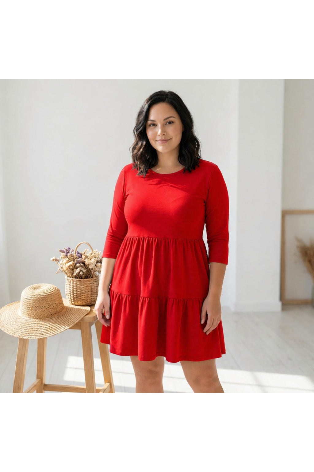 Šaty mají volnější střih s jemným řasením v pase, který krásně schová drobné nedokonalosti a zároveň zvýrazní ženské křivky. Délka nad kolena působí mladistvě a svěže, zatímco 3/4 rukáv zajišťuje komfort i v přechodném období.
